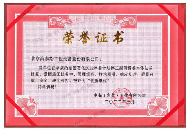 海泰斯獲評“優(yōu)質(zhì)單位”!負責的催化裝置、常減壓裝置泄漏法蘭的在線修復和定力矩緊固施工任務,實現(xiàn)了“零泄漏”的目標。